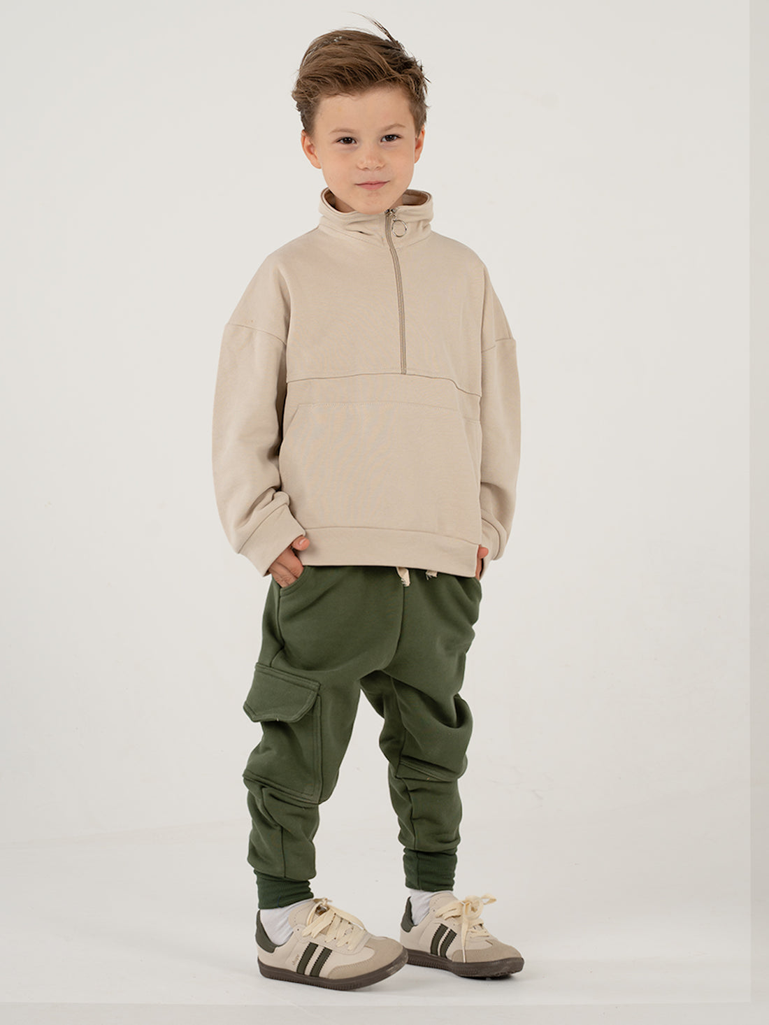 Çağla 3 İplik Yandan Cepli Eşofman - Krem Fermuarlı Sweat