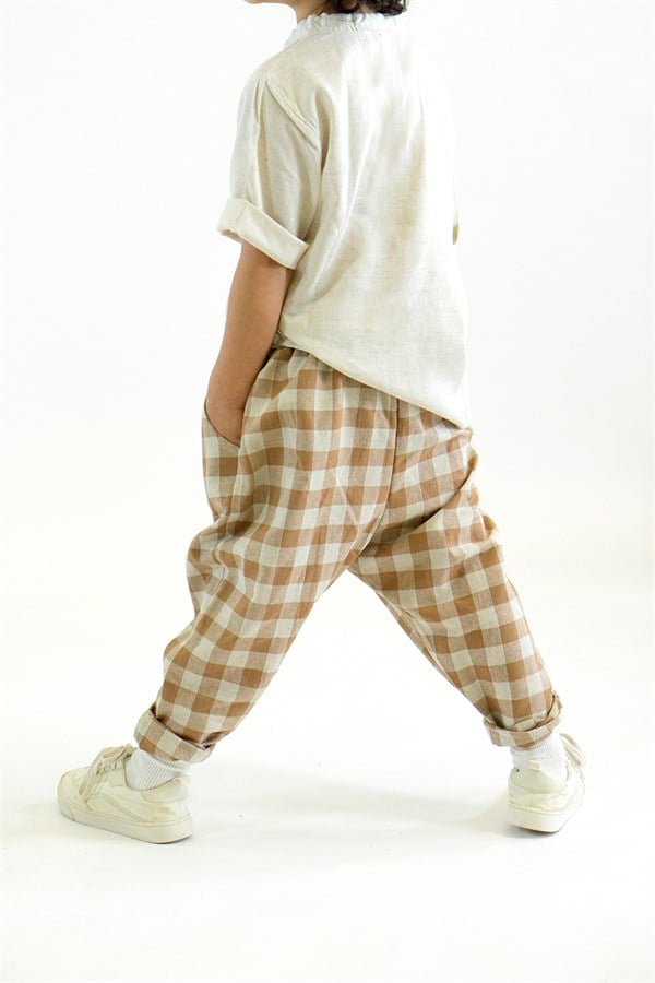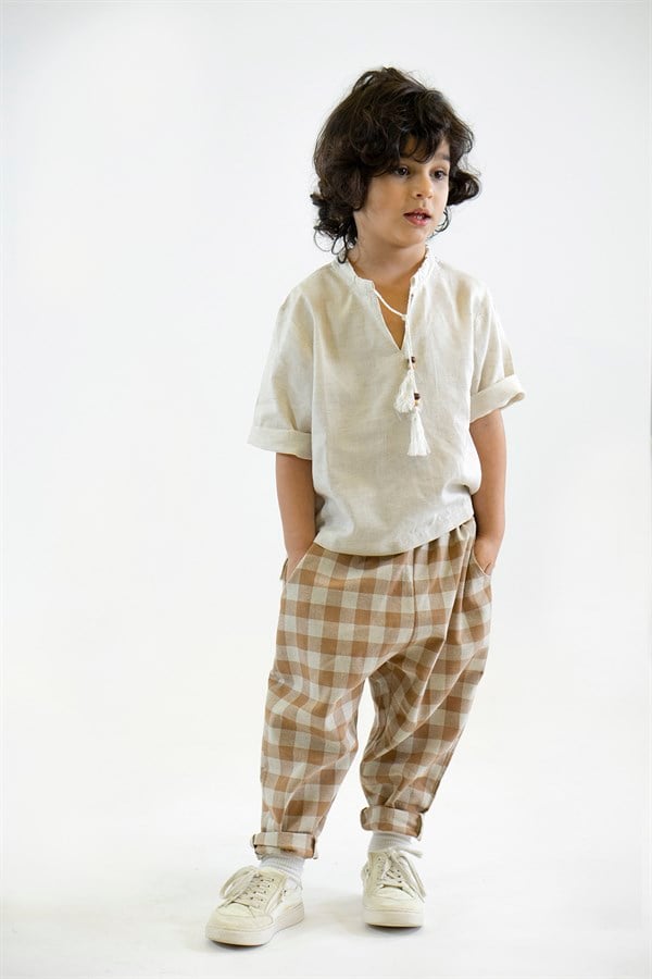 - Carrot Pantolon Vizon Krem Ekose Keten + Krem Keten İpli Gömlek