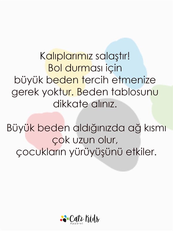 - KALIPLARIMIZ SALAŞTIR BEDEN TABLOSUNUNA GÖRE ALMANIZI TAVSİYE EDERİZ.
