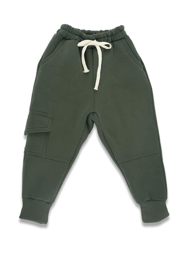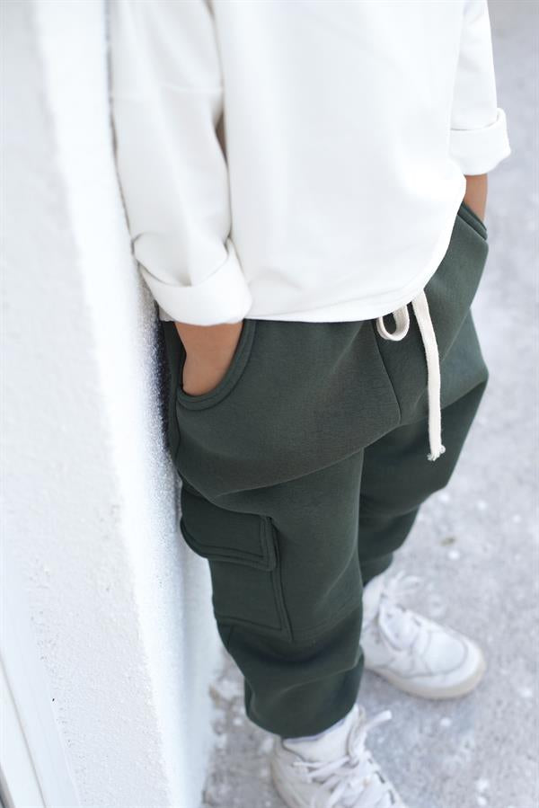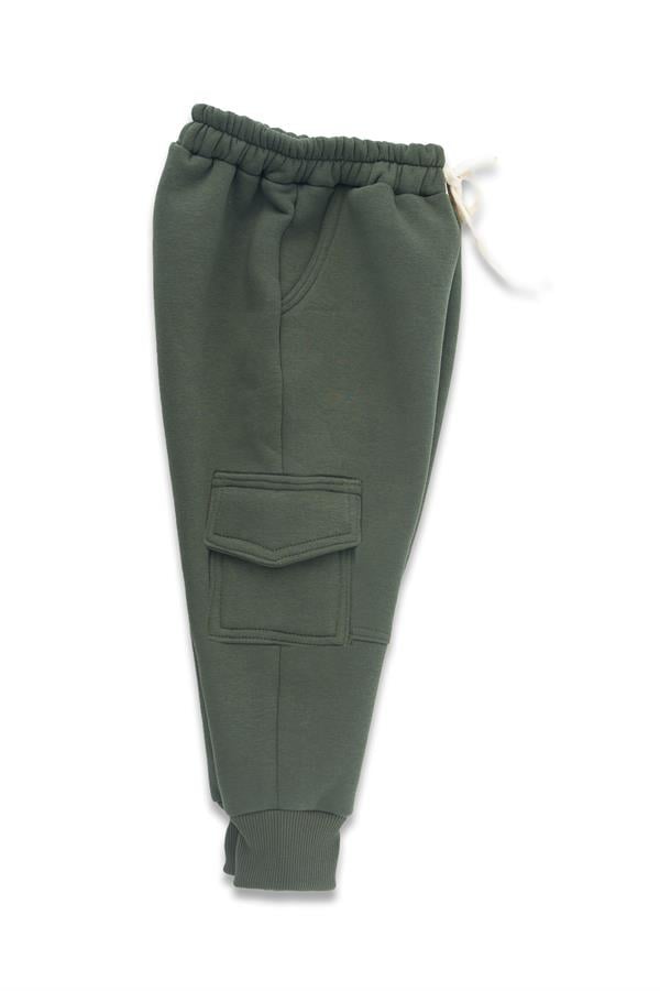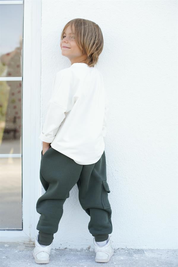 Çocuk Eşofman Takım - Haki 3 İplik Şardonlu Yandan Cepli Eşofman - Krem Penye Sweat