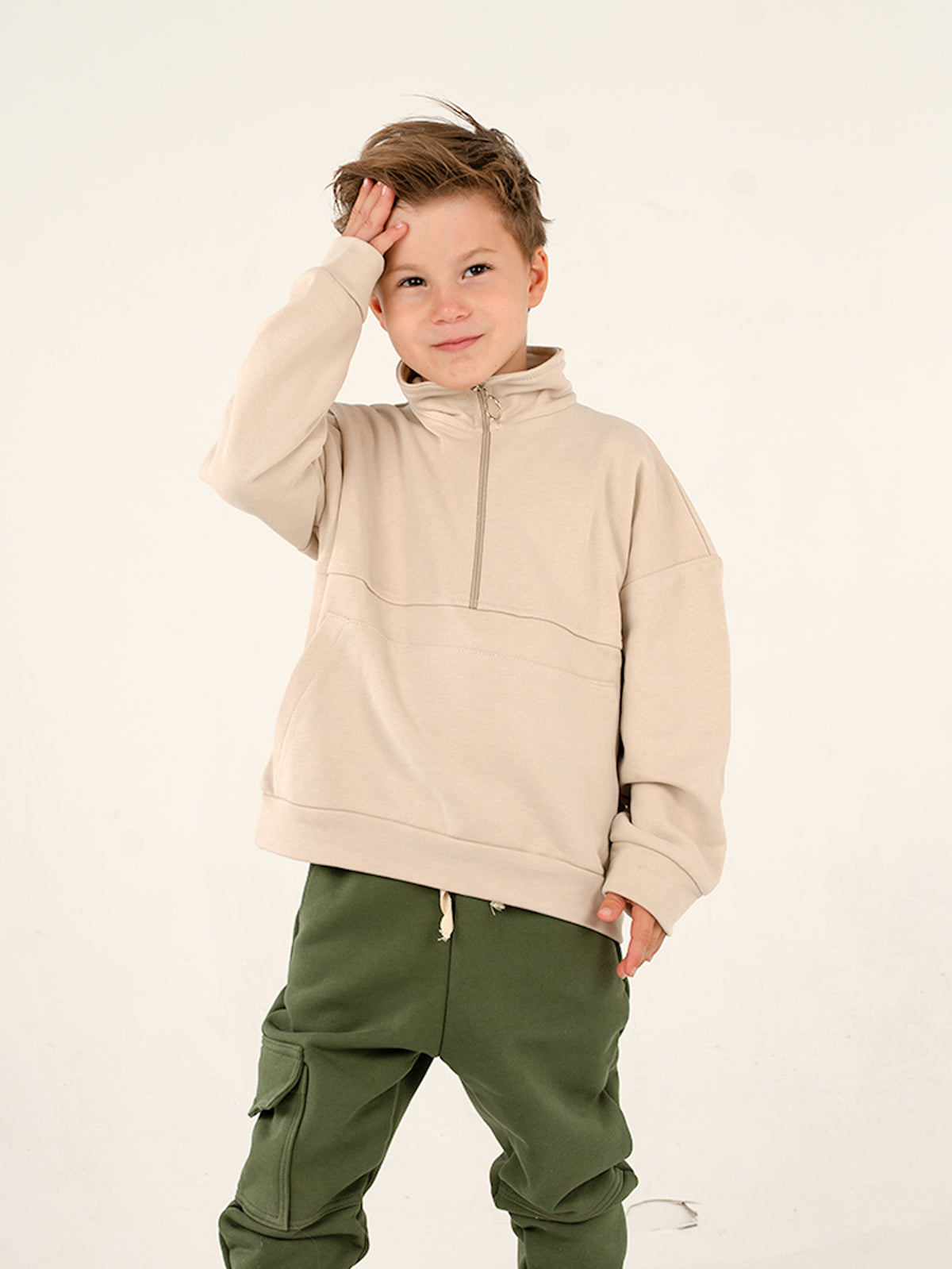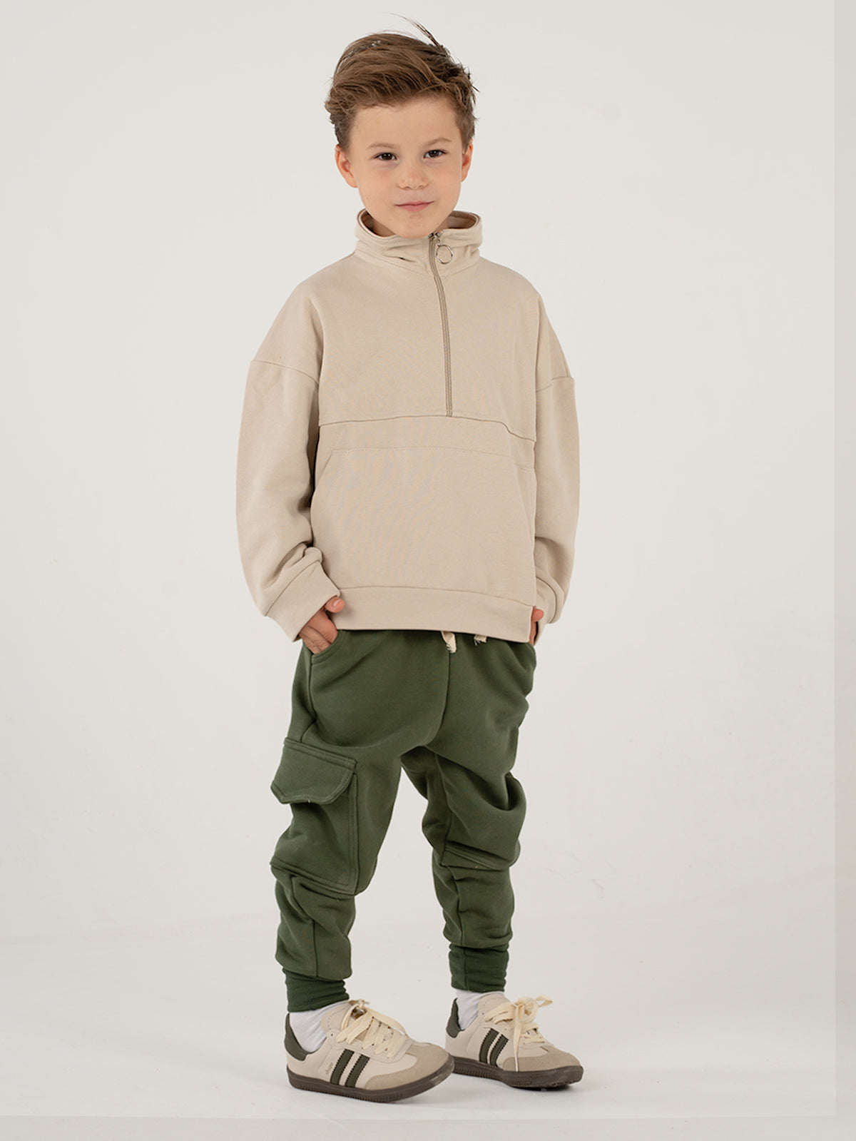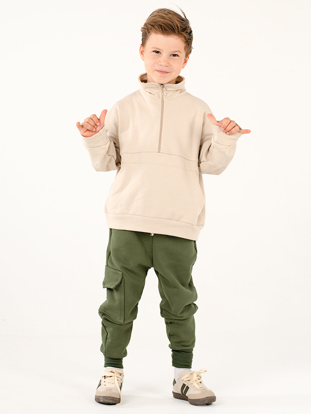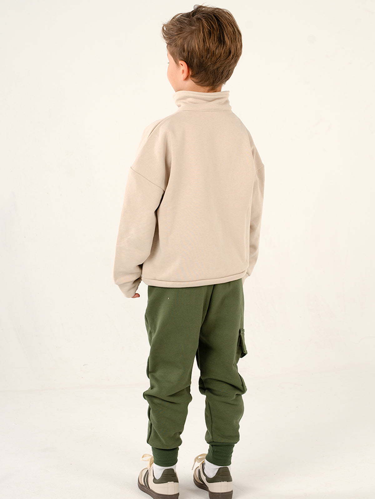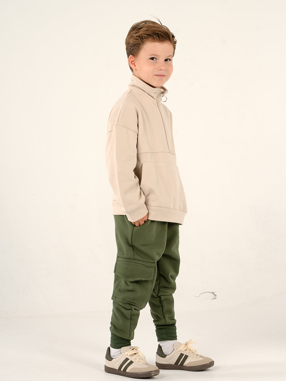Çağla 3 İplik Yandan Cepli Eşofman - Krem Fermuarlı Sweat