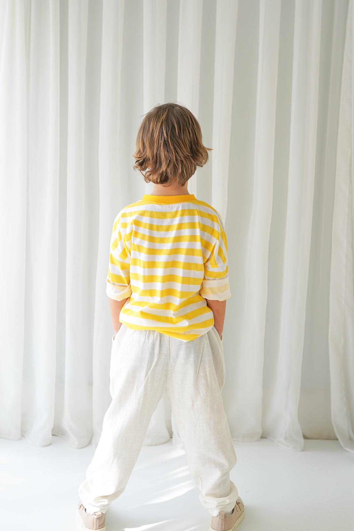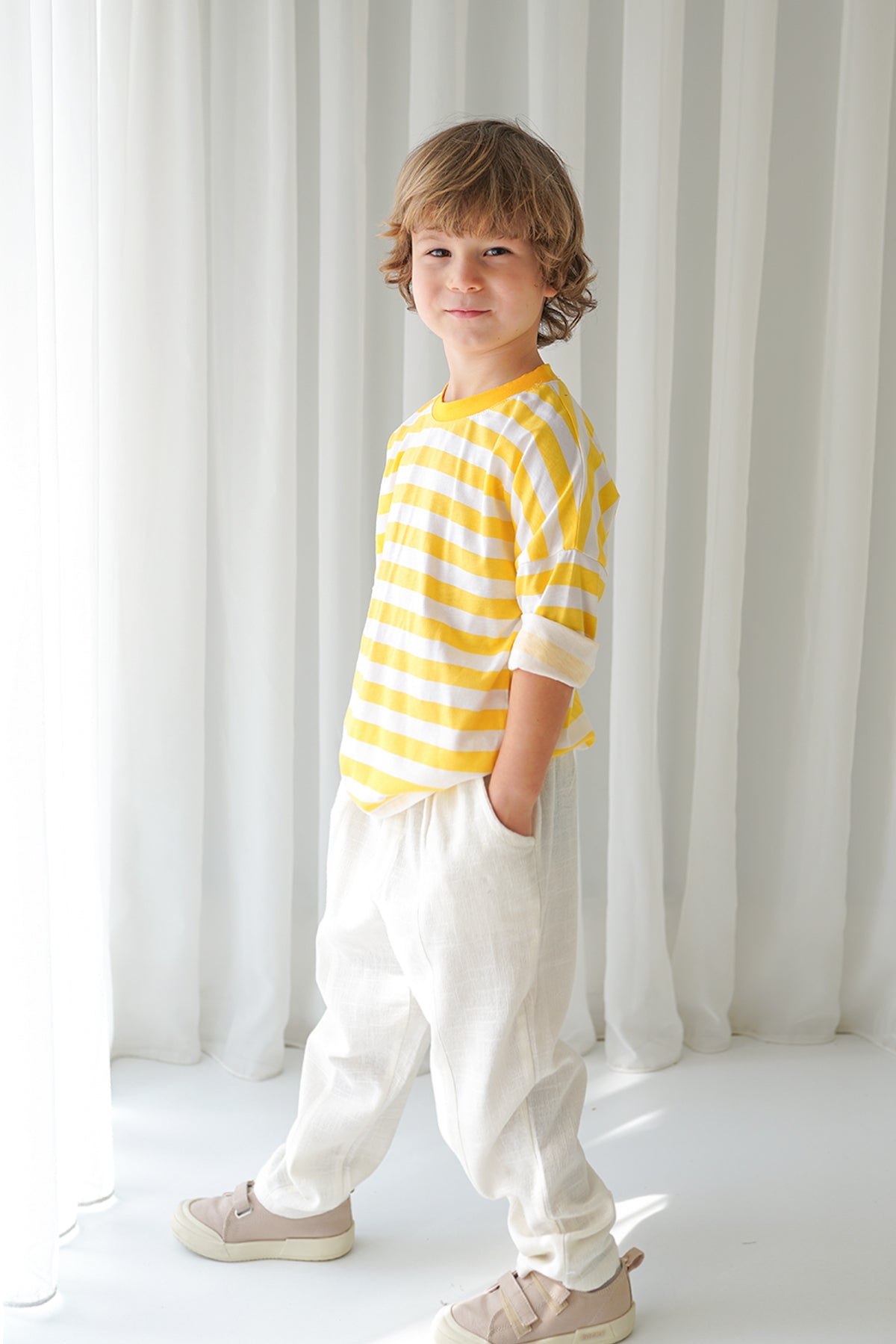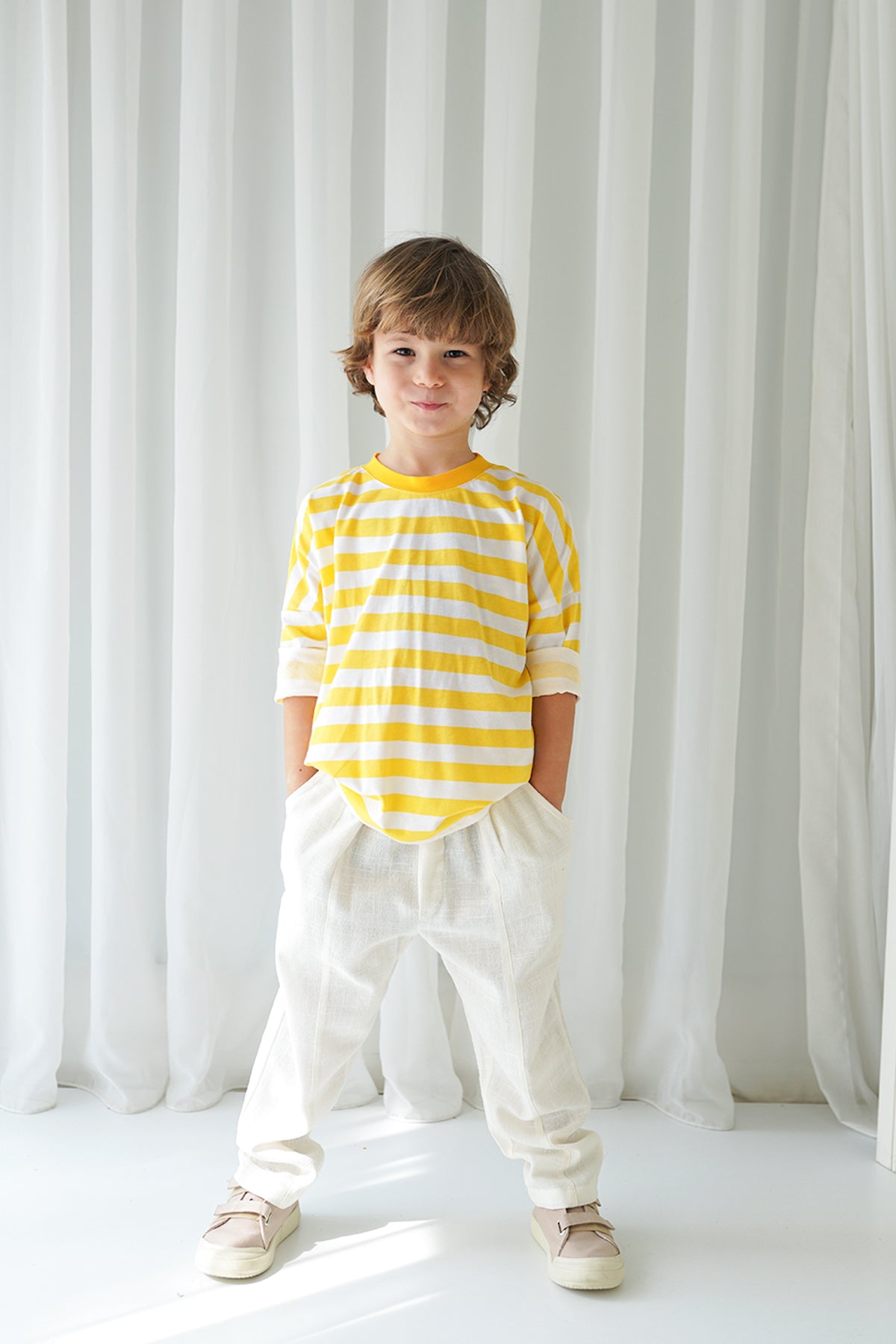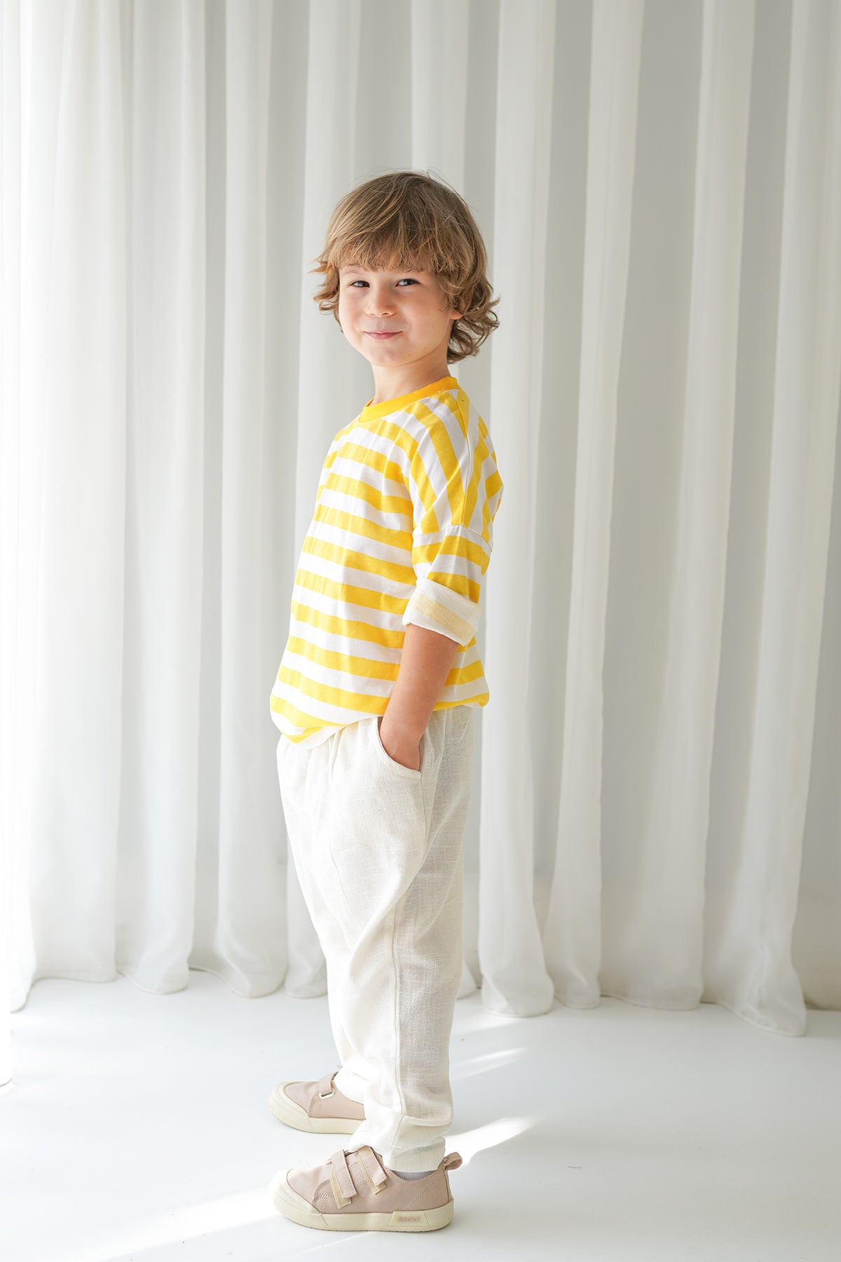 Erkek Çocuk Ekru Keten Carrot Pantolon + Sarı Beyaz Çizgili Penye T-Shirt