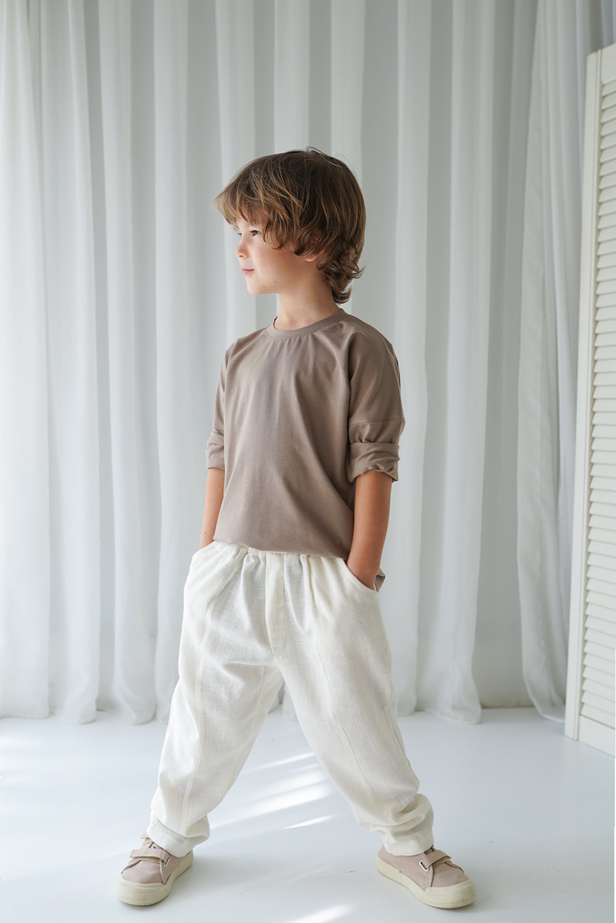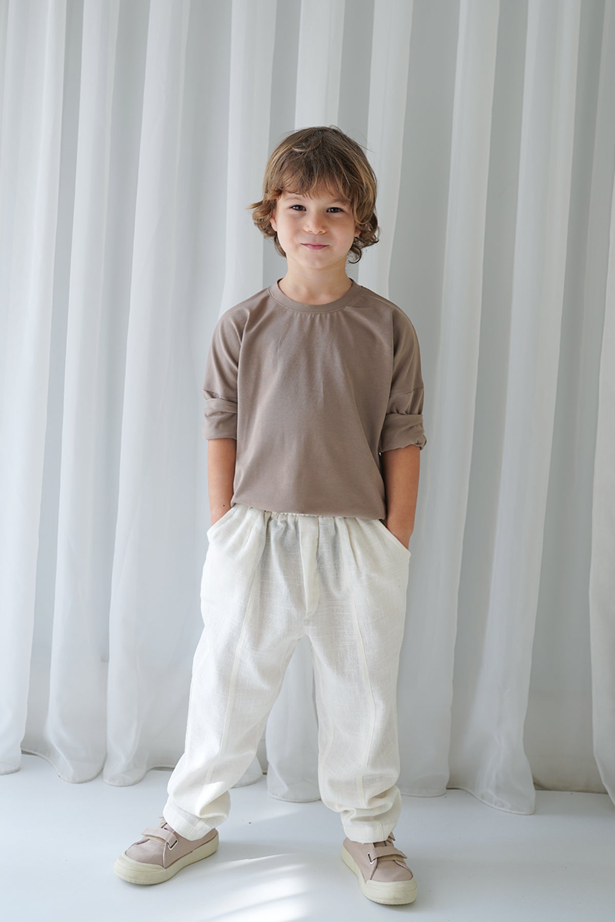 Erkek Çocuk Ekru Keten Carrot Pantolon + Vizon Penye T-Shirt
