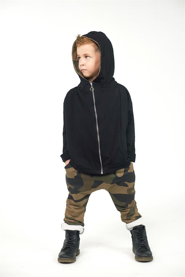 Haki Kamuflaj Desen Harem Pantolon + Haki Siyah Kamuflaj Kapüşonlu Fermuarlı Sweat