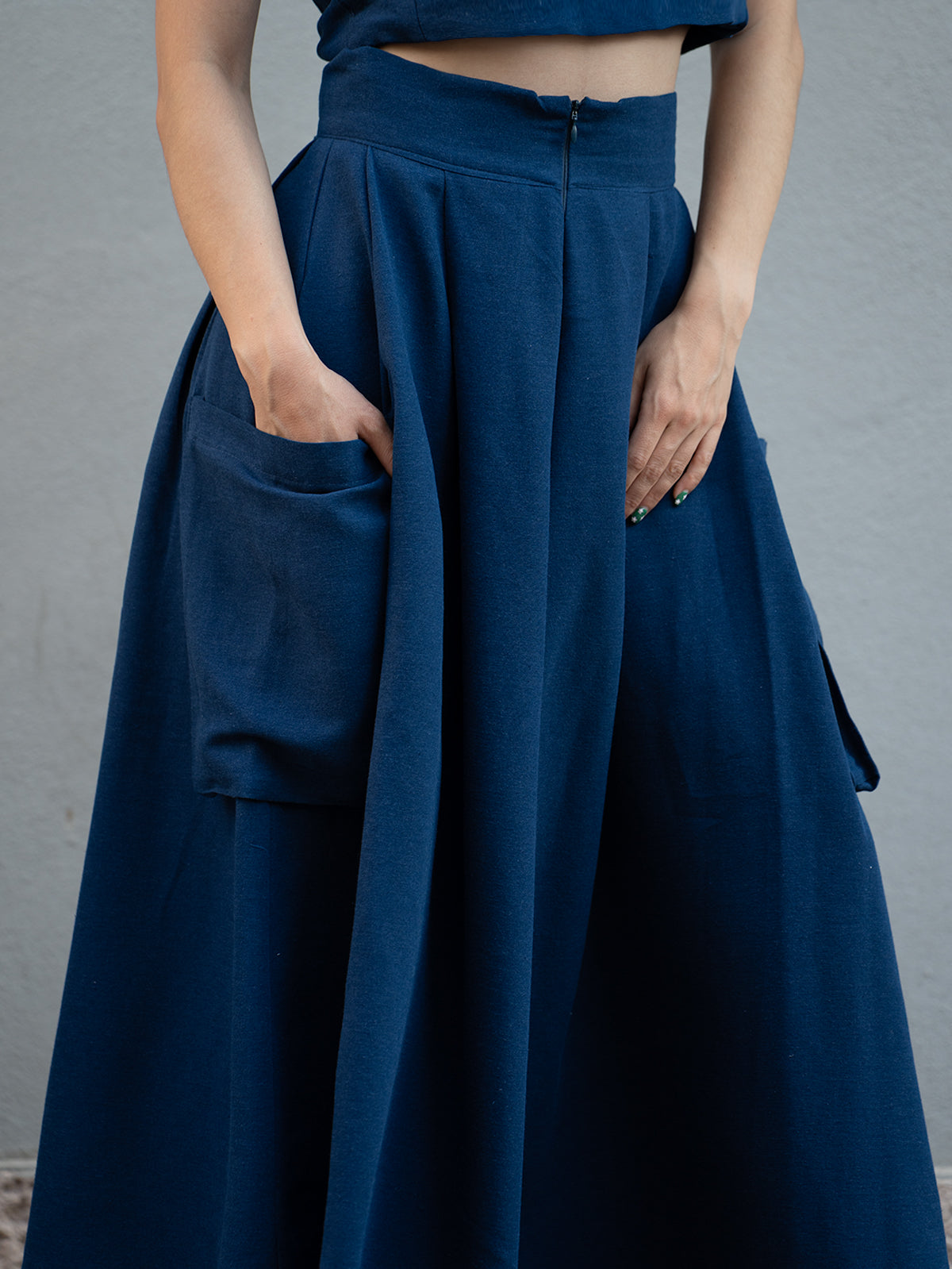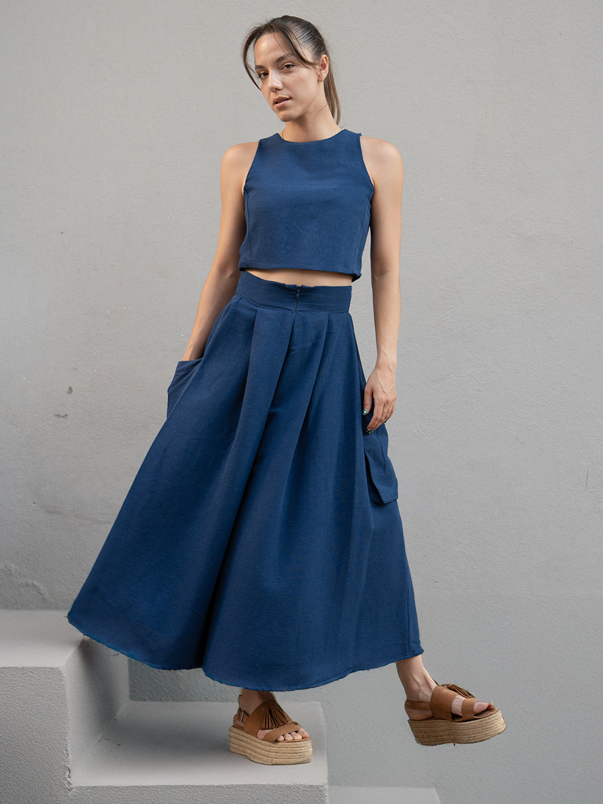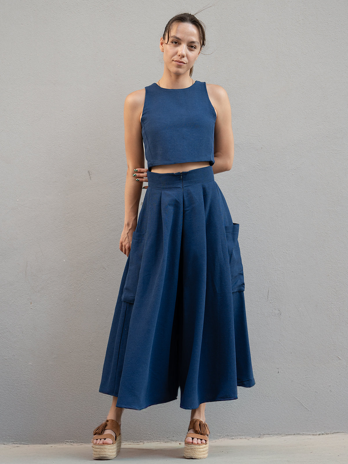 İndigo Keten Kali Kargo Pantolon ve Crop Bluz Takım