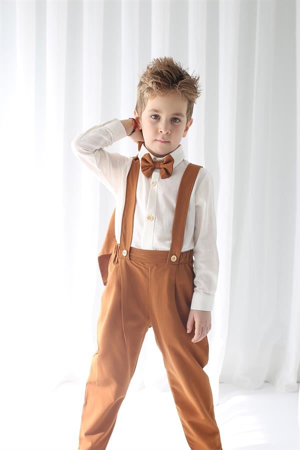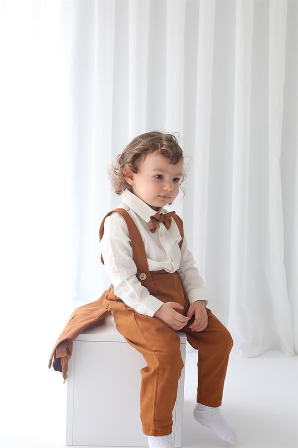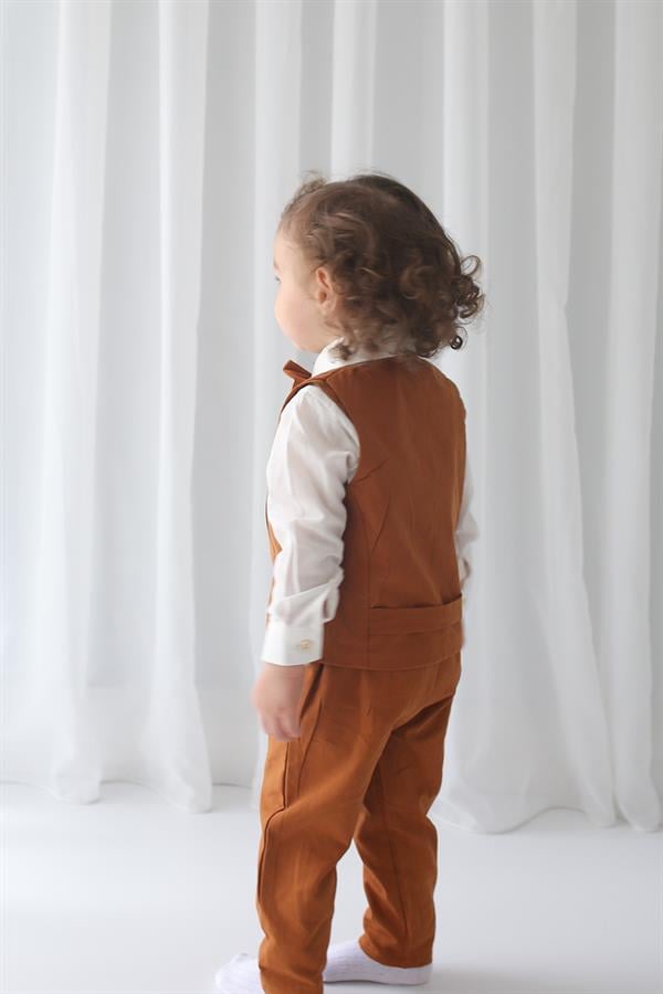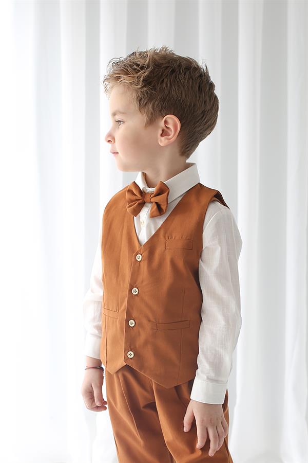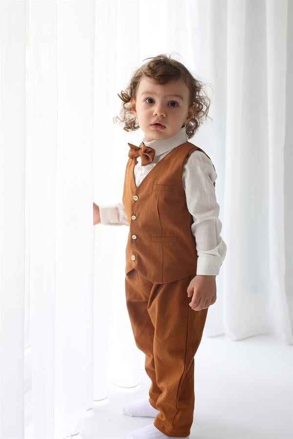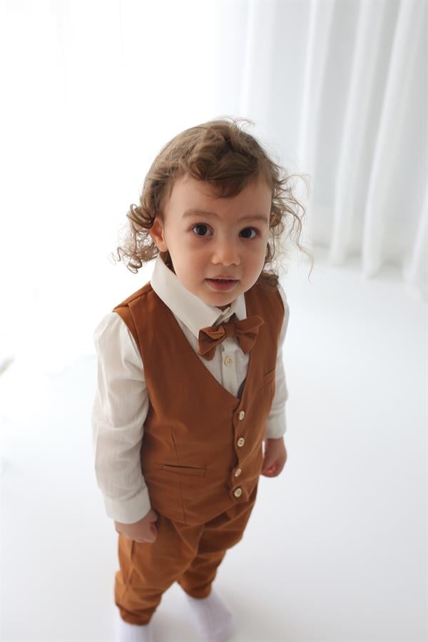 Kahverengi Keten Yelek + Pantolon + Gömlek + Papyon