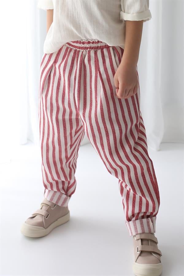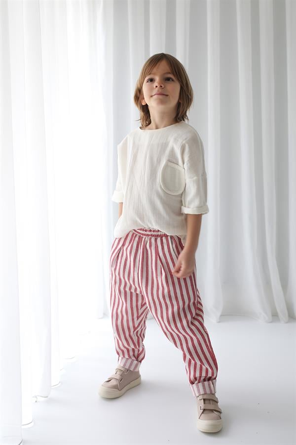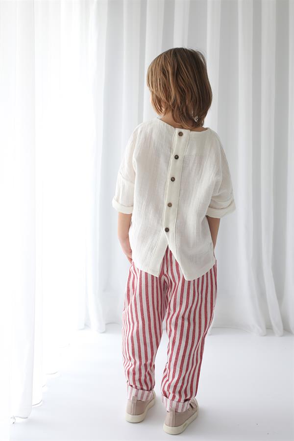 Kırmızı Çizgili Keten Carrot Pantolon Ve Ekru Şile Bezi Gömlek
