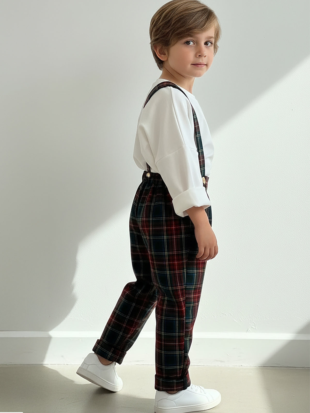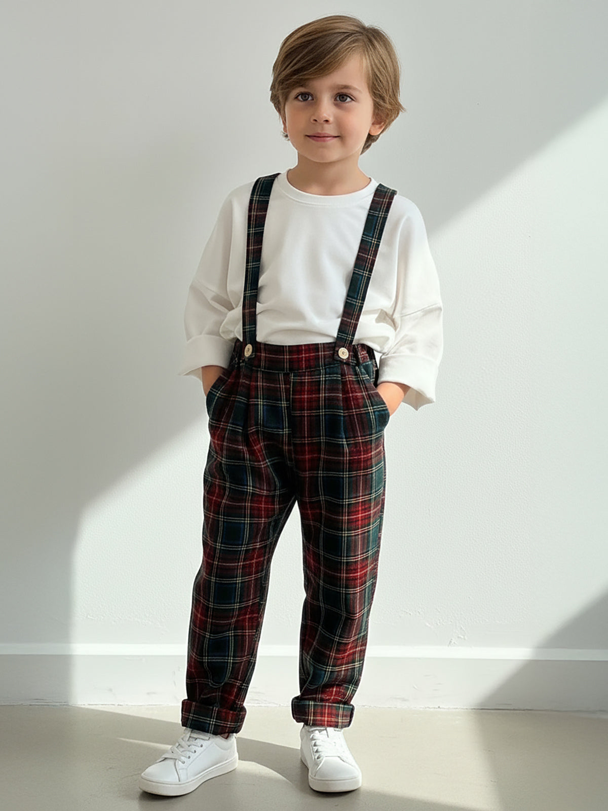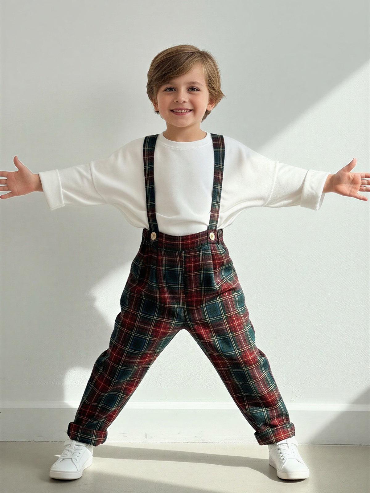 Kırmızı Ekose Desen Askılı Pantolon