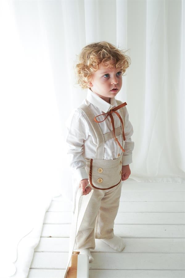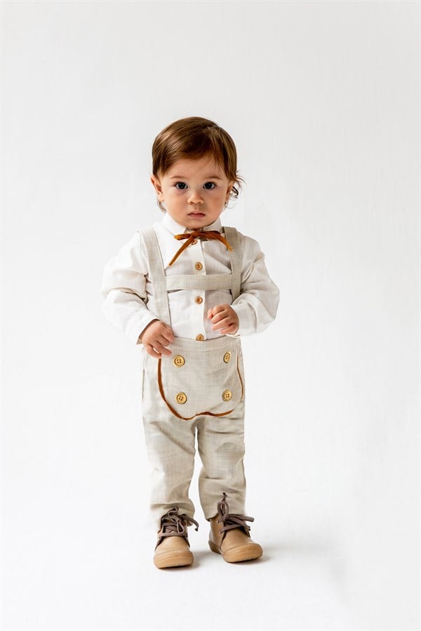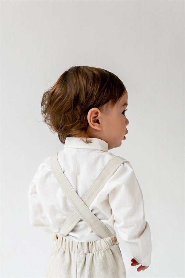 Krem Keten Düğmeli Salopet Pantolon & Beyaz Gömlek