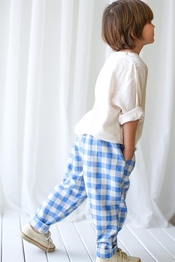 Mavi Krem Ekose Carrot Pantolon + Krem Keten İpli Gömlek