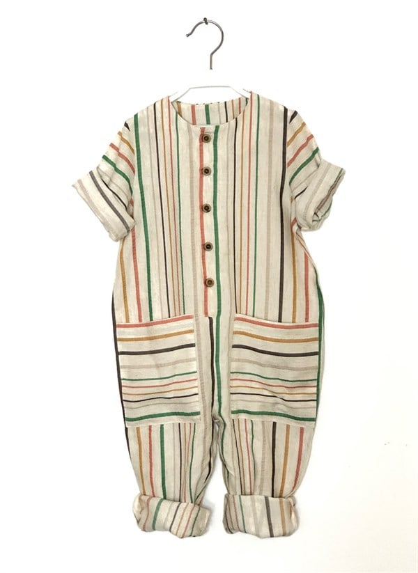 Renkli İnce Kalın Çizgili Kısa Kollu Cepli Tulum