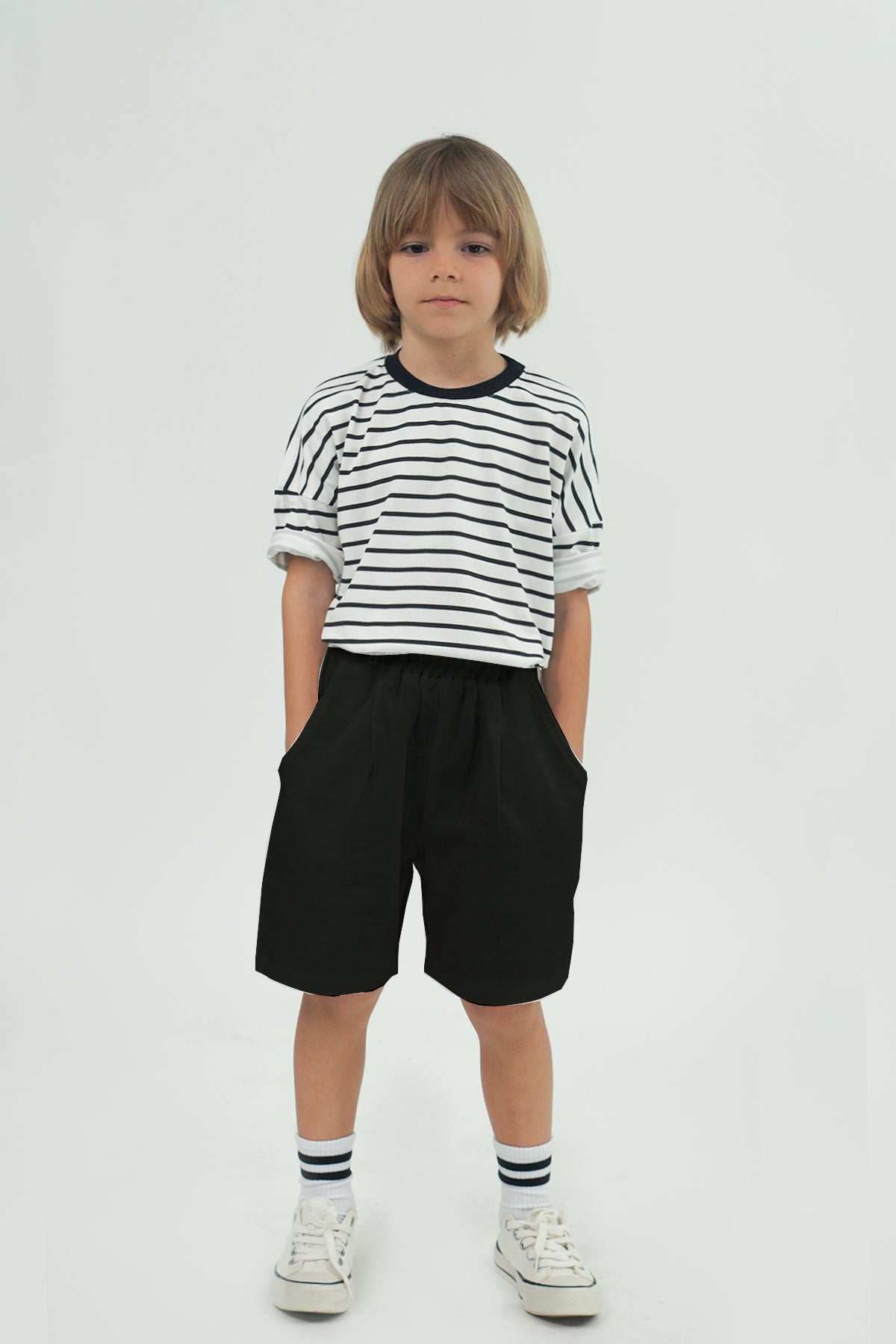 Siyah Beyaz Çizgili T-shirt - Siyah Müslin Şort Takım
