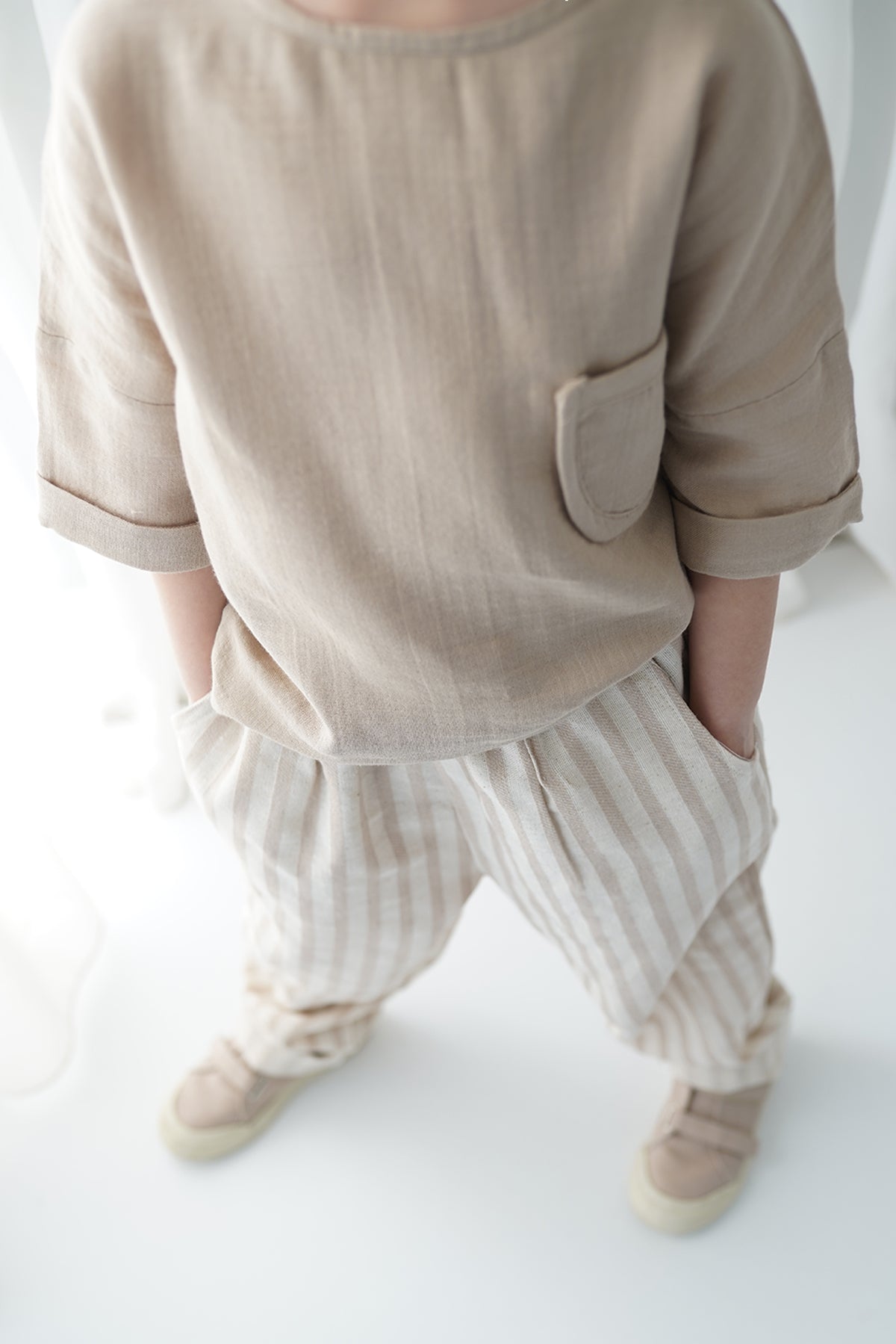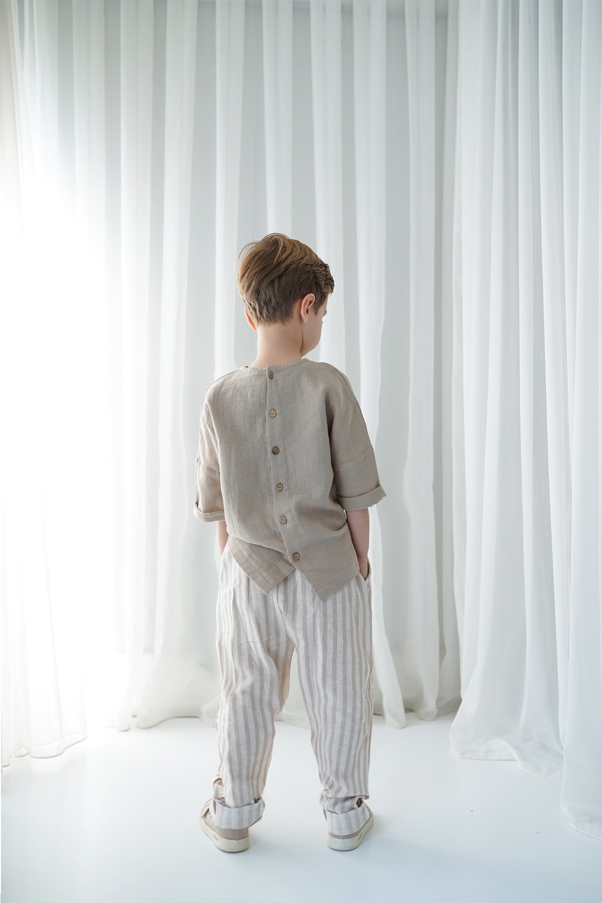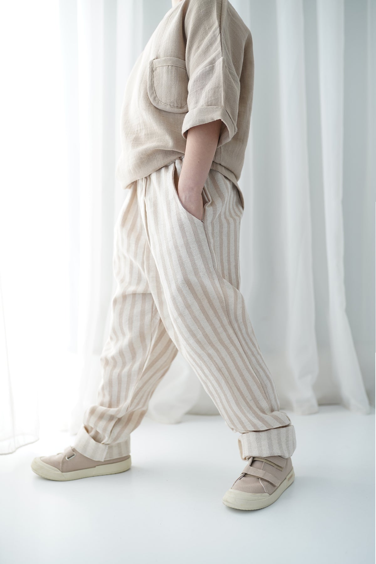 Vizon Krem Çizgili Keten Carrot Pantolon+Vizon Müslin Gömlek